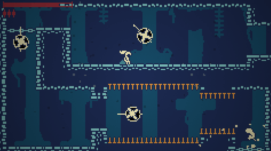 - Blasphemous 2 - I went back to analyze this game and found that basically every room has some point of interest in it. The points of interest can be a platforming challenge, combat challenge, big scary enemy, NPC, secret, or just a nice piece of artwork, but every room has something specific to do. I tried to do that in my game as well.